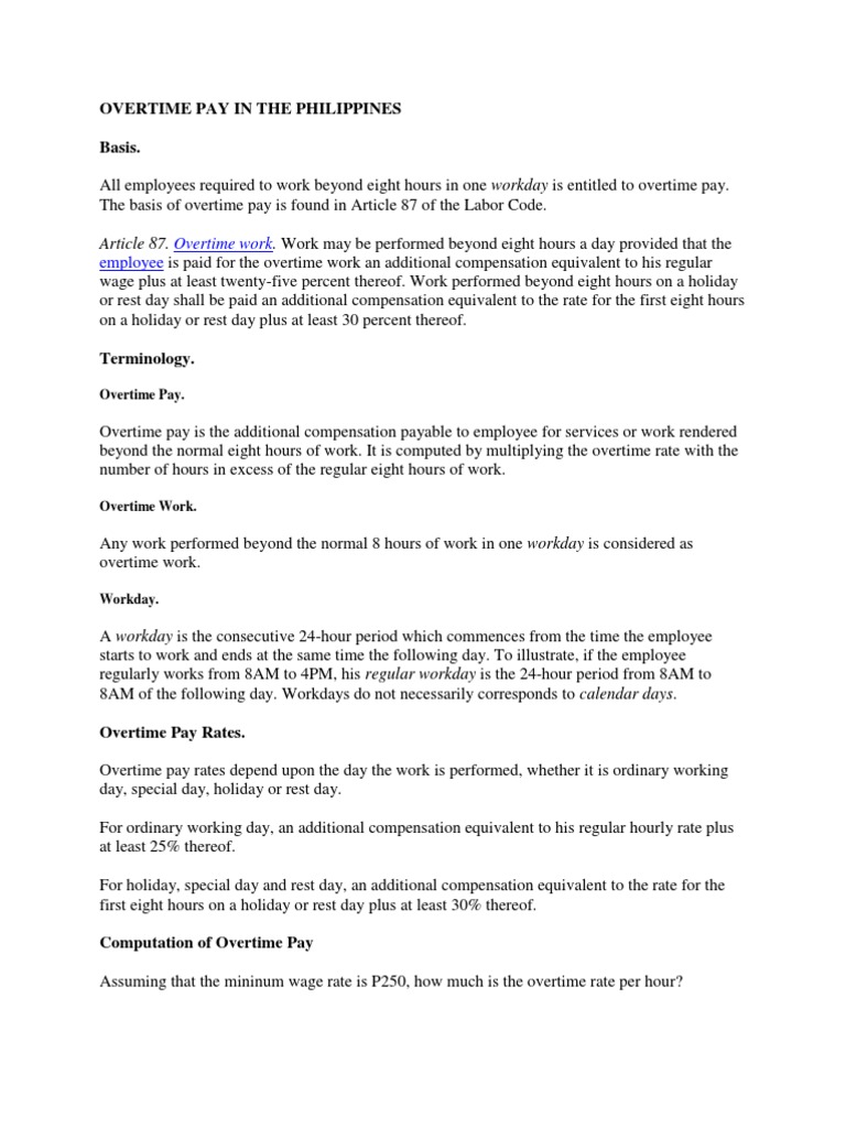 Dherence to philippine legislation regarding overtime work not only ensures compliance on your end, but if you are running a business in the philippines, you must know the policies regarding overtime pay how many hours are allowed for overtime work?